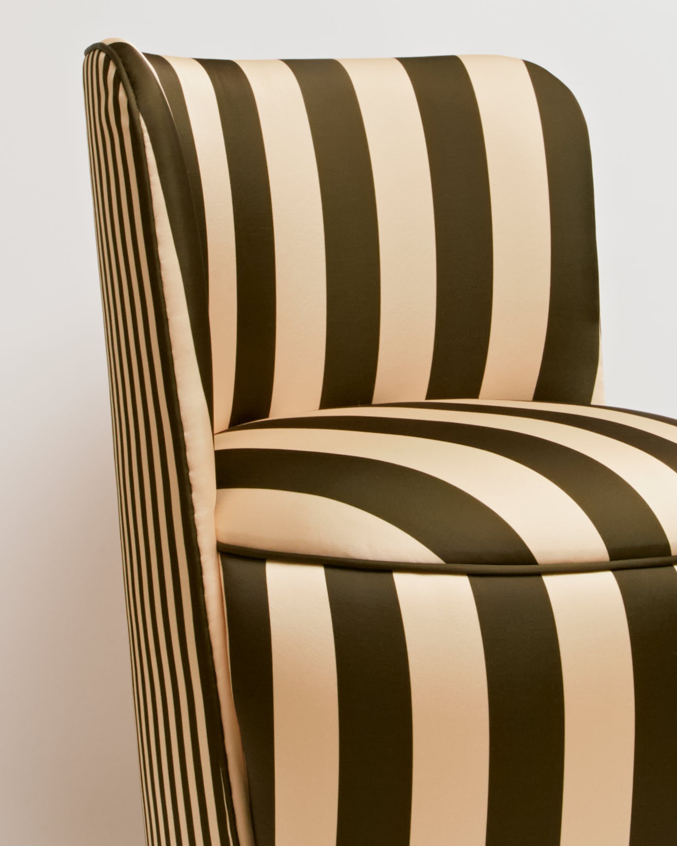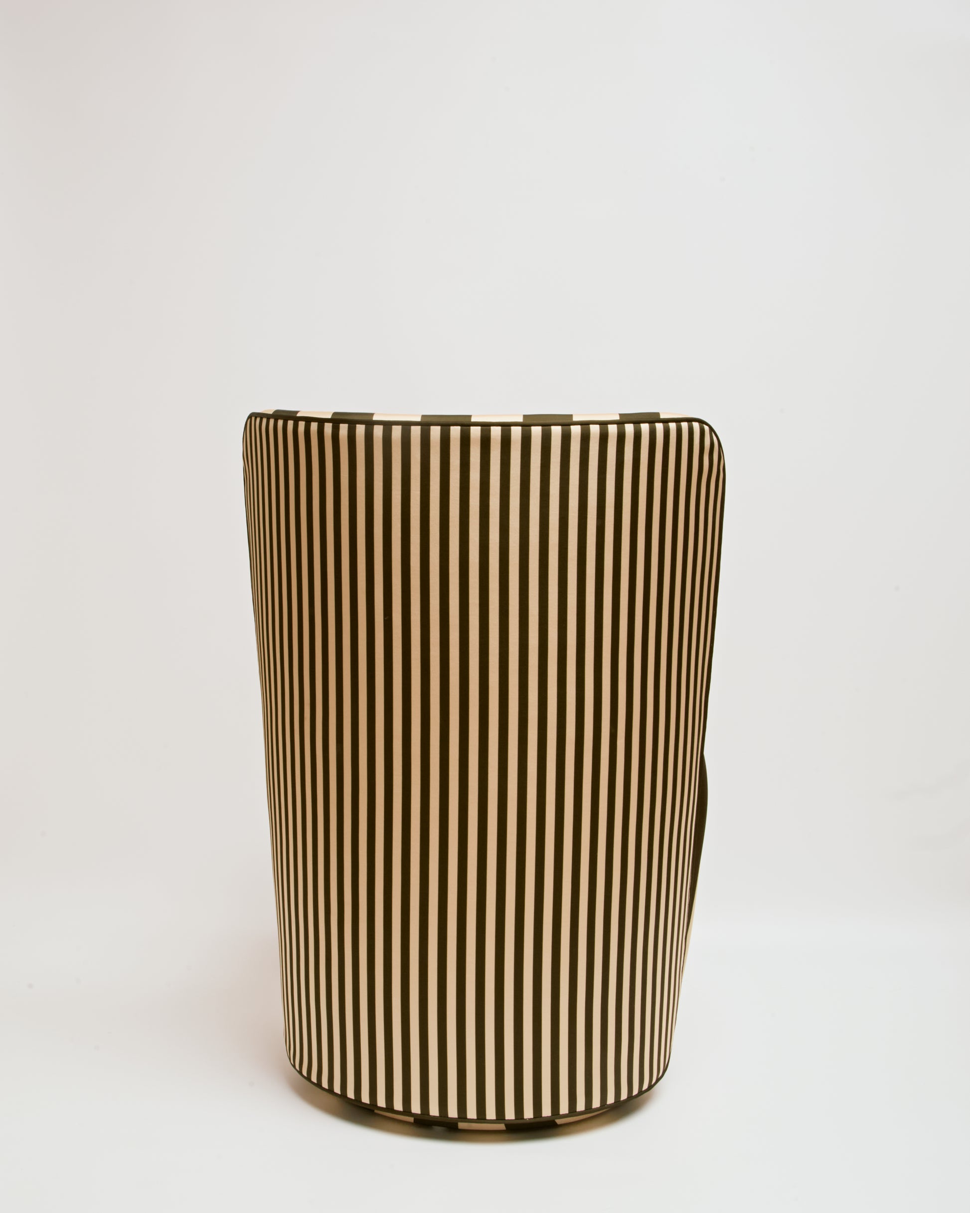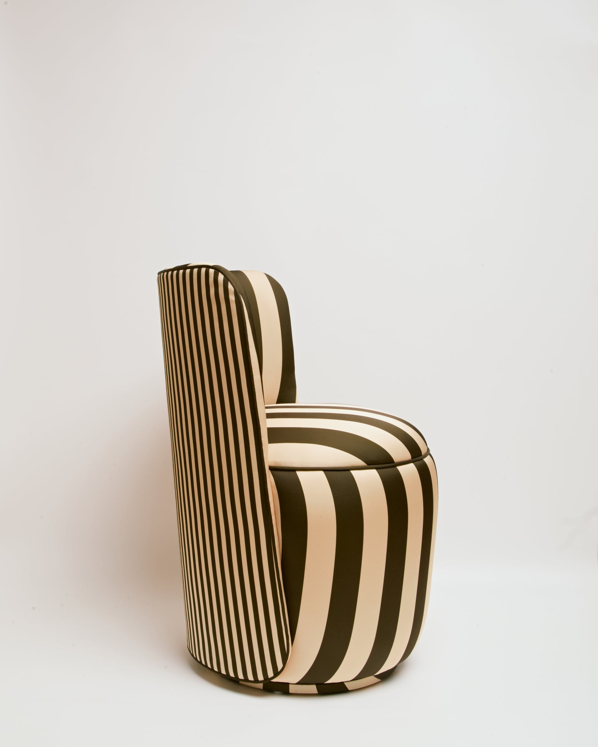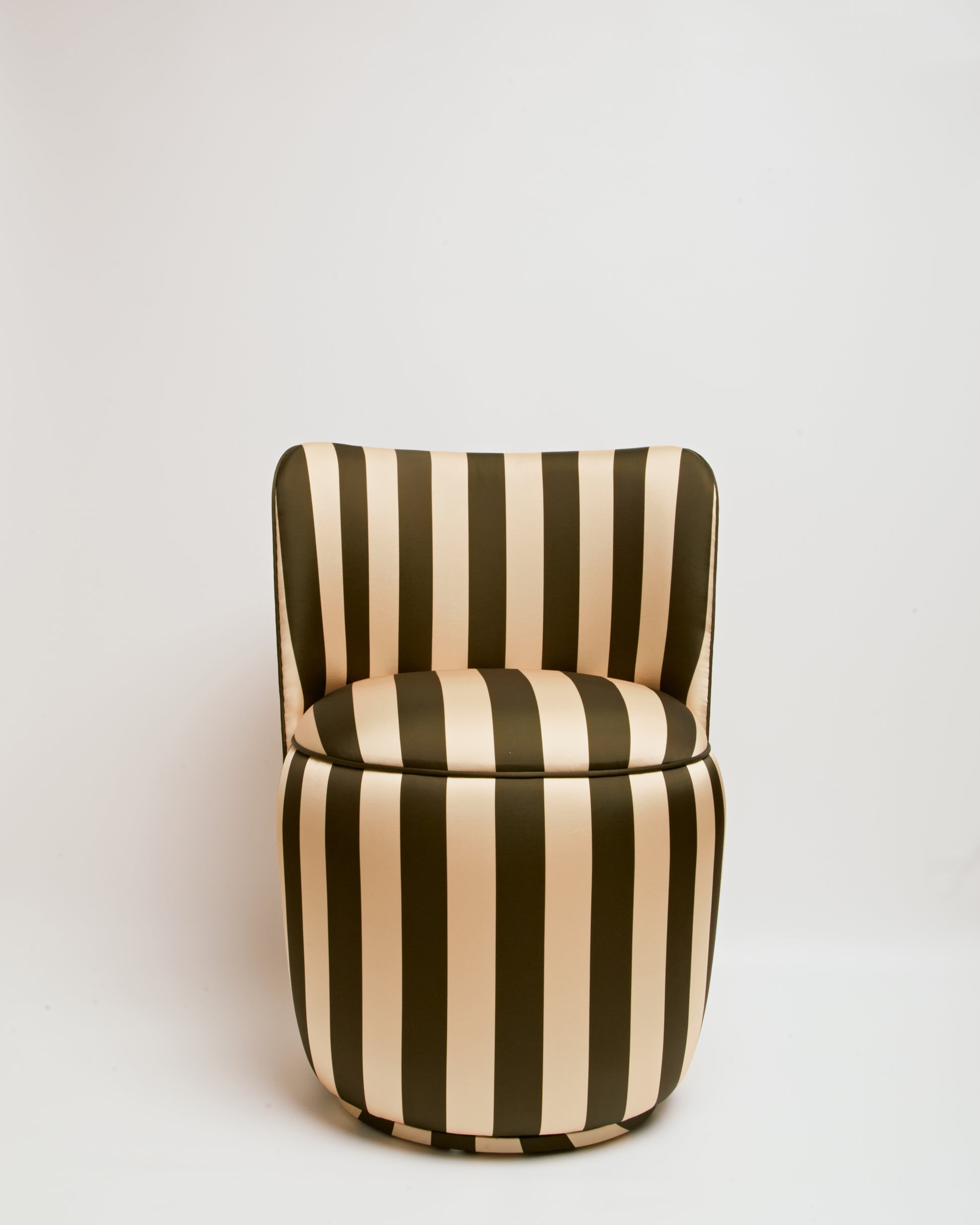 Revestida em tecido seda, a peça apresenta brilho sutil, toque sofisticado e profundidade de cor, elevando o padrão listrado a uma leitura mais refinada. A base giratória adiciona funcionalidade com elegância, permitindo movimento fluido sem interferir na estética.